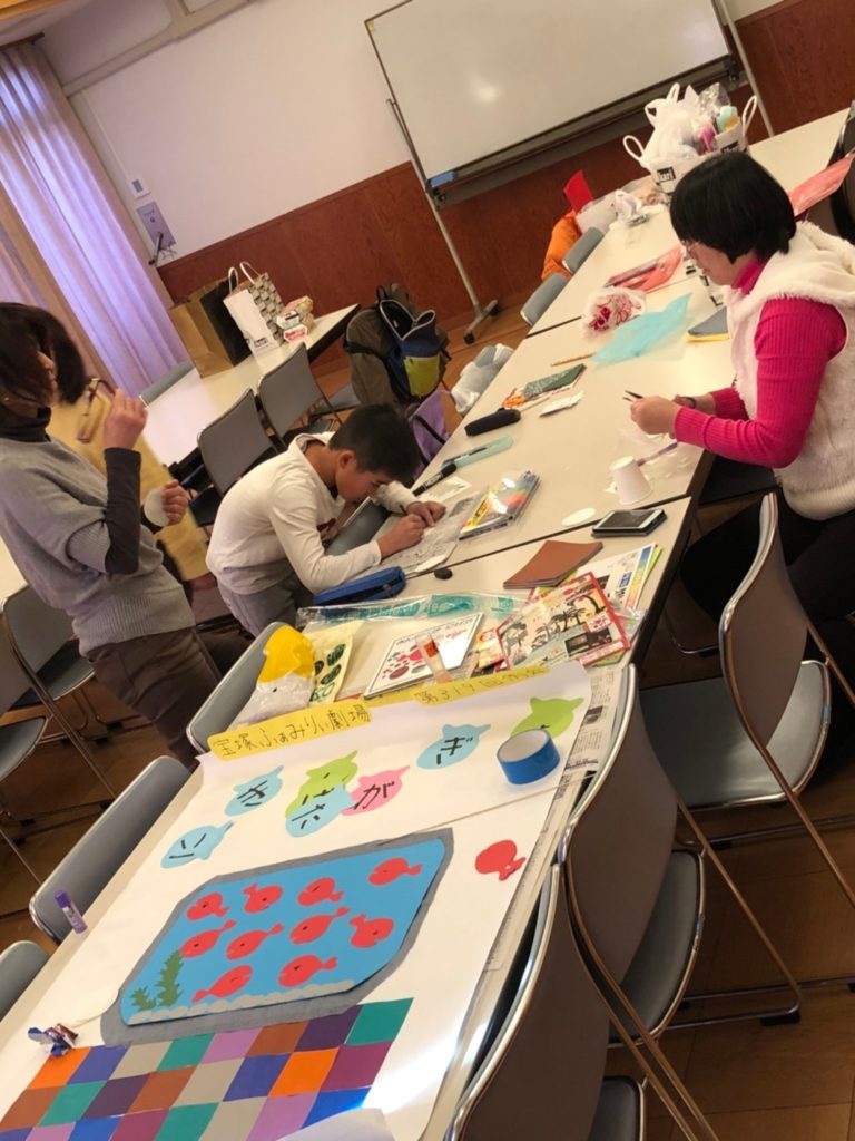 12月25日、小学校の終業式の後、西公民館で1月19日の例会「きんぎょがにげた」の立て看板作りをしました。