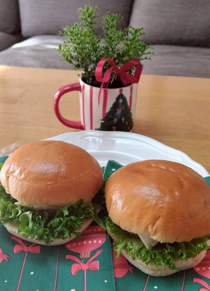バンズ、パテ、フリルレタス、トマト、ピクルス、スライスチーズ、照り焼きソース、ケチャップを重ねて、一人一人、自分のハンバーガーを作りました。