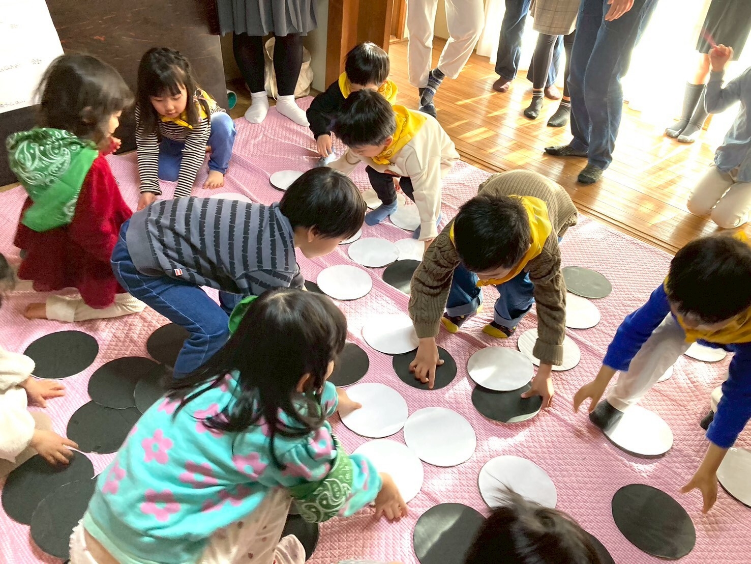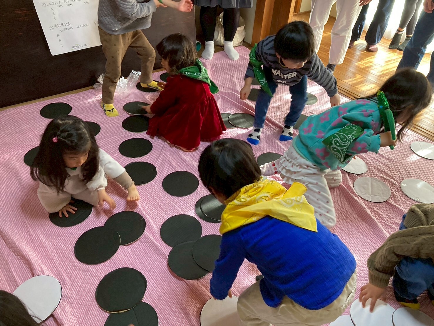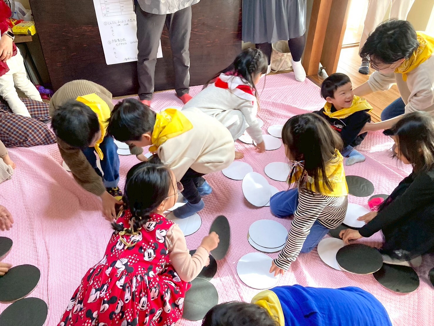 ハンバーガーでお腹いっぱい、になったあとは、ゲーム大会です。赤、黄、緑の3チームに分かれて2つのゲームで対戦です。
