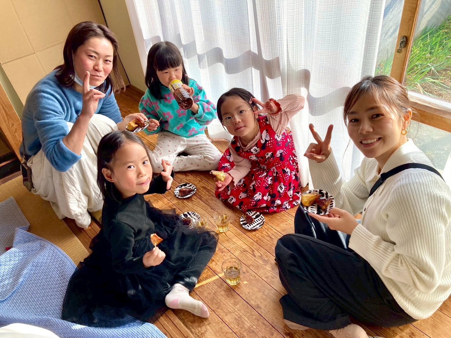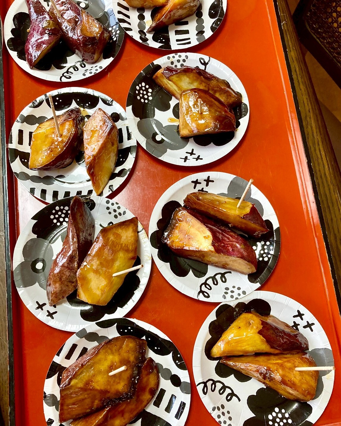 熱々の「大学芋」を食べて、小休止。さつまいもは、望月ハウスの畑で収穫したものです。