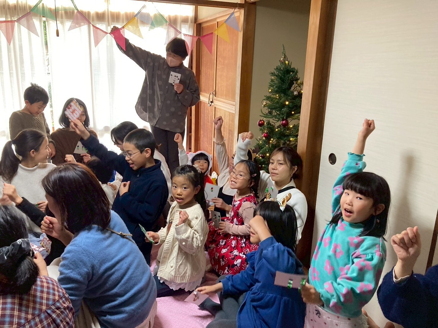 12月14日(日)、望月ハウスで、恒例の「クリスマス会」を開きました。参加者は、45人(幼児14人、小学生10人、青年1人、大人20人)でした。
