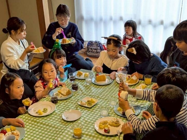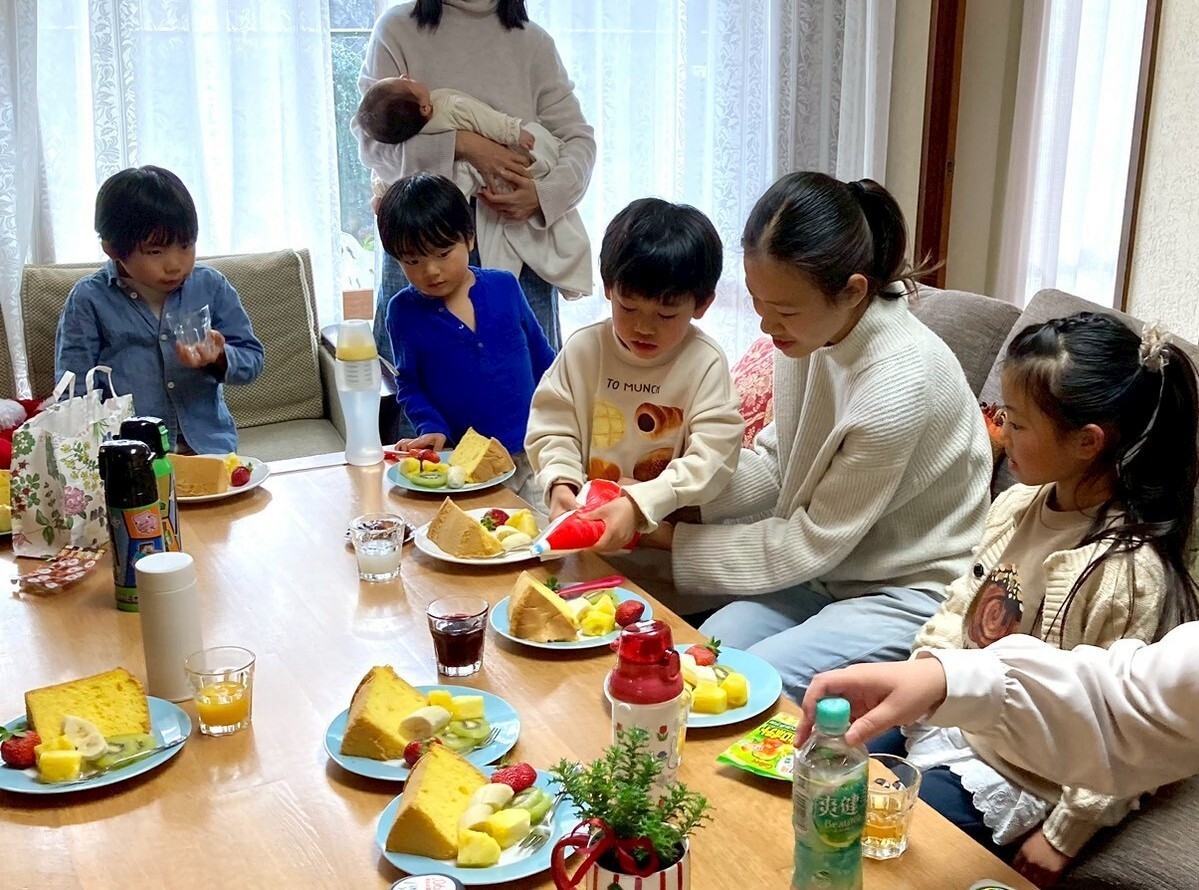 3時になりました。「クリスマスケーキ」の時間です。ホイップクリームを自分で飾って。