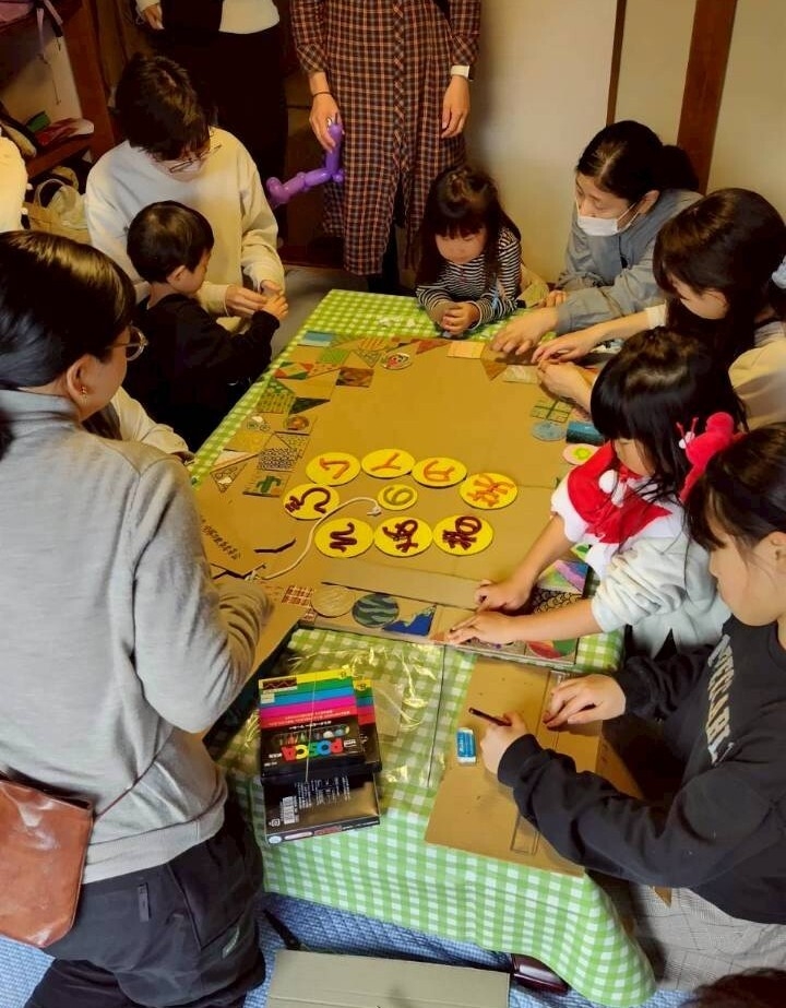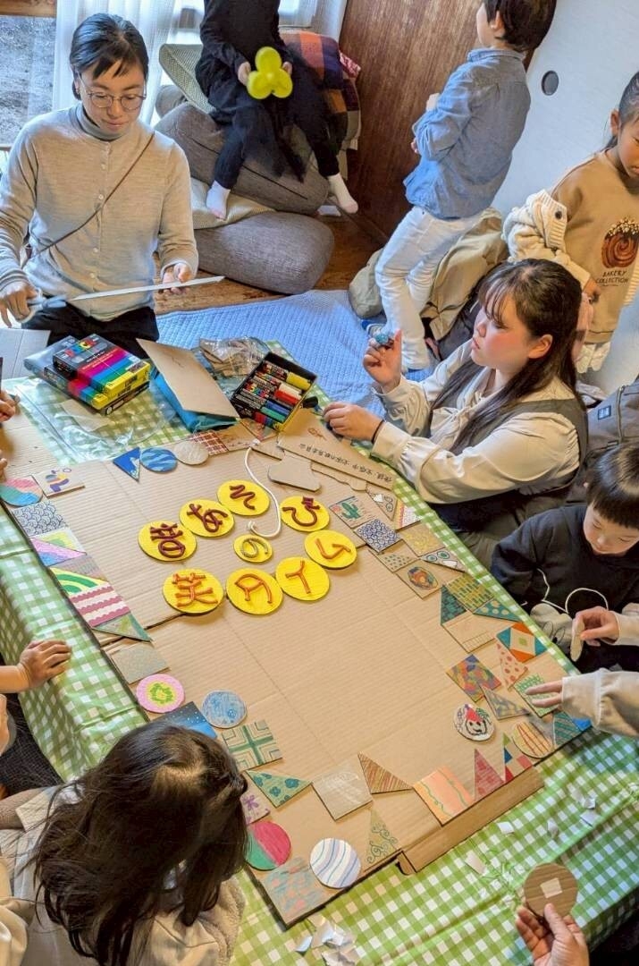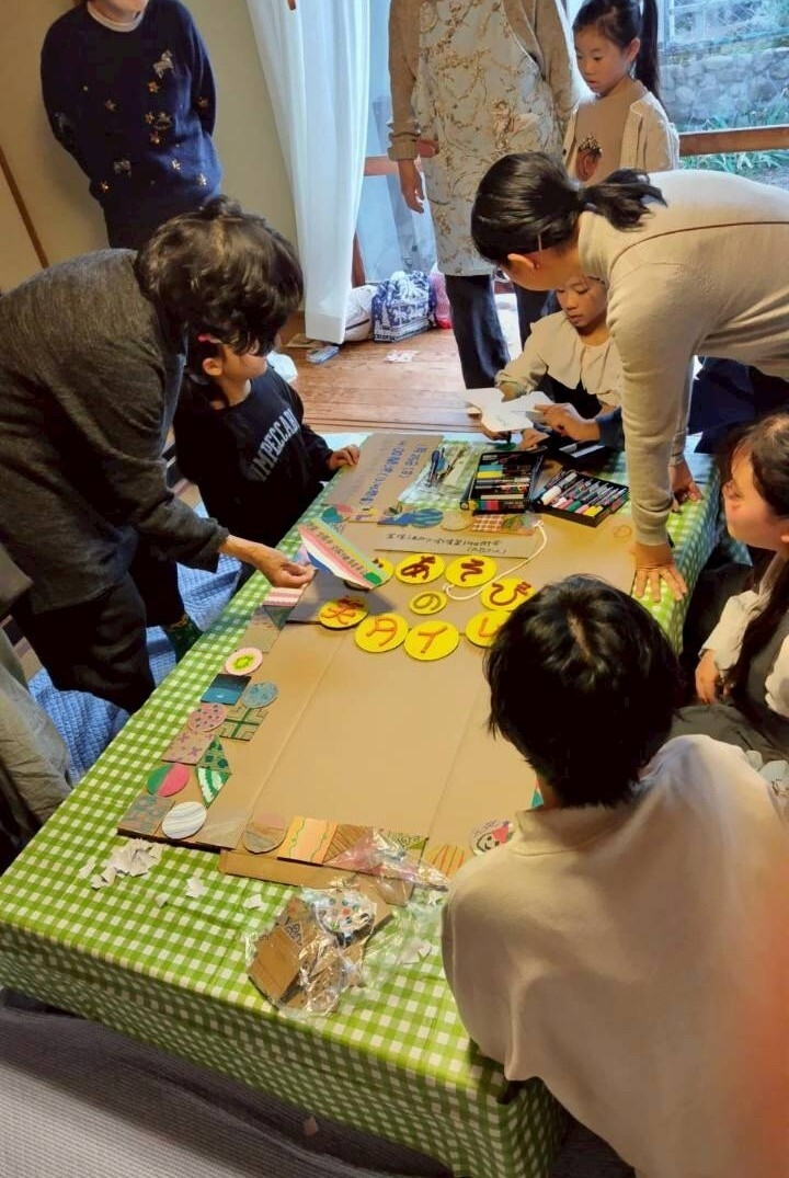 タイルを貼ったり、字を書いたり、手分けして作業して、5時前に完成! 寄せ合わせて仕上がった看板が、とても賑やかで楽しそうです。